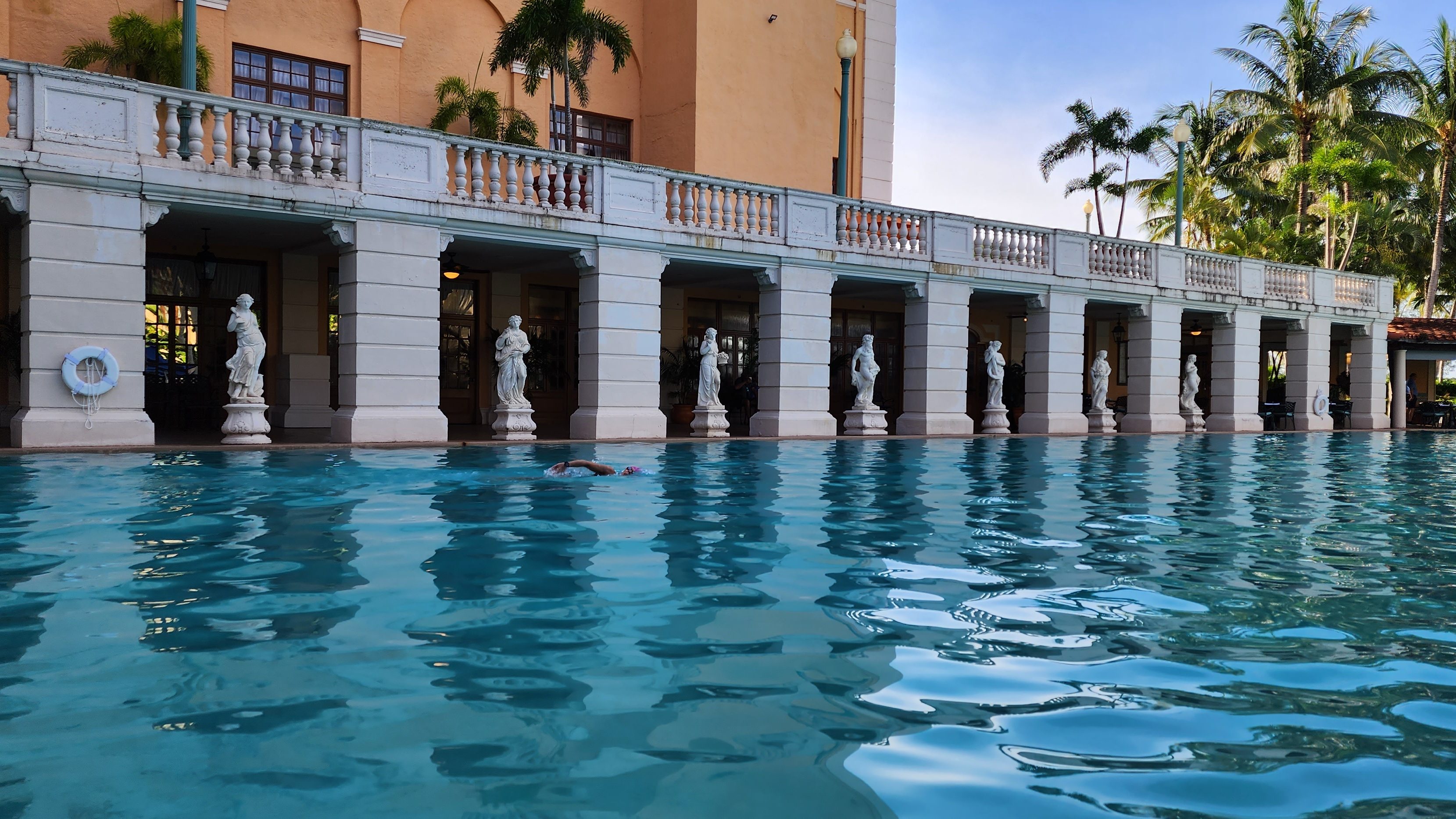 Rippled sunlight illuminating bright Catalina tiles in Marilyn Monroe’s favorite pool. Black lines stretching to what seems like eternity in a behemoth of a basin created by the US Army Corp of Engineers. White Roman statues overlooking an expanse of vibrant blue under Florida’s morning sun. A poolside glass of champagne (a toast to finishing a challenge) where luxury once hid government secrets. I could go on, but that’s for the blog!