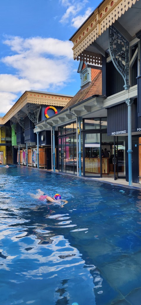 Everything about this swim was lovely, from the pool itself to the friendly and knowledgeable staff and the multicolored Edwardian building that surrounds the pool. An interesting structural aspect is the lack of windows facing the area outside the complex. When I asked about this curious omission, staff informed me that ladies had needed their privacy to bathe. Also, the pool water flows over raised infinity edges, which deter jumping or diving and therefore add to the calm spa atmosphere.