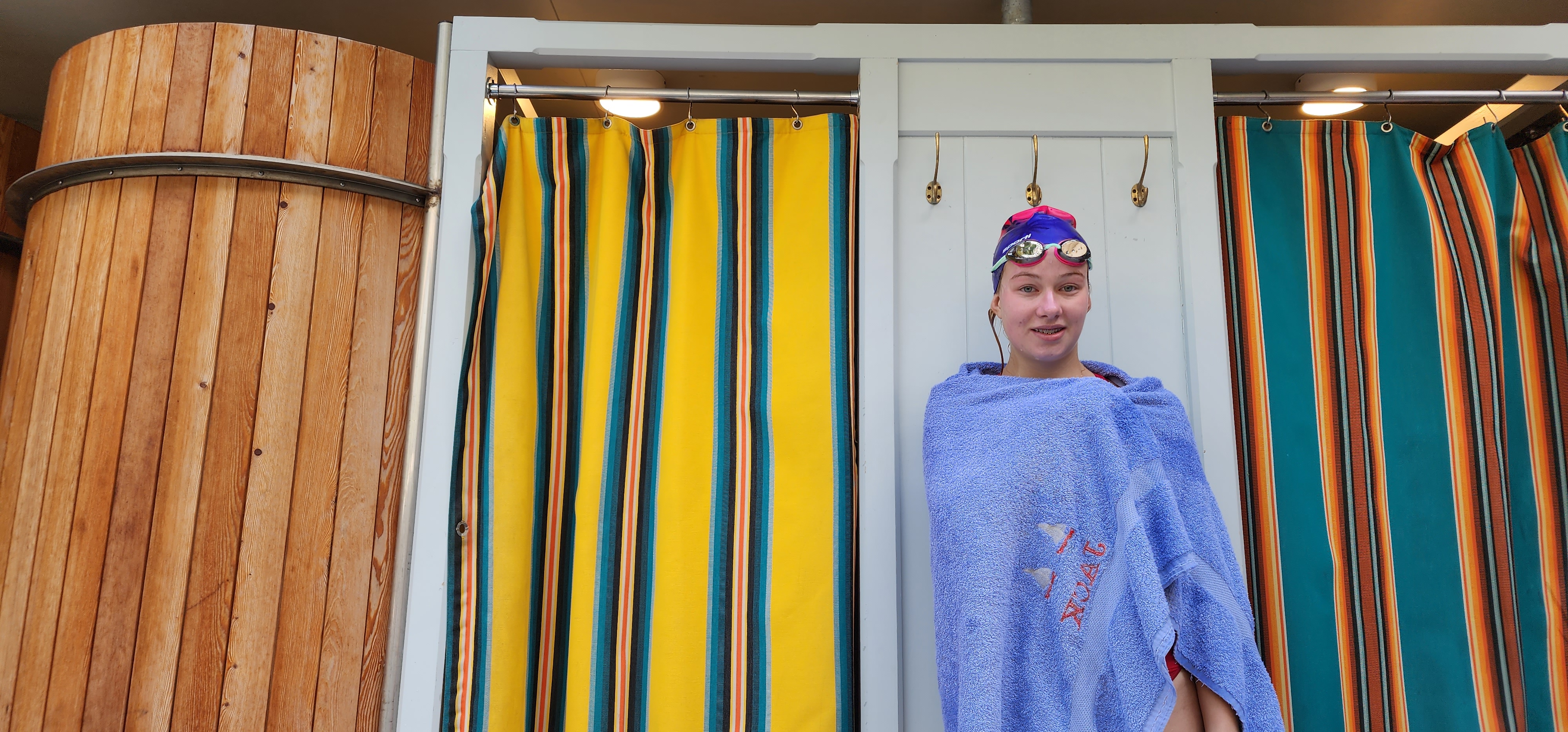 At first toe-dip, the 25C water felt a wee bit chilly to us warm water swimmers. Fortunately, the required pre-swim shower in the outdoor enclosed wood stalls was not. Daughter pulled the brightly striped curtain closed, I tugged the rope, and warm water streamed down our faces and bodies from the rain-shower head.