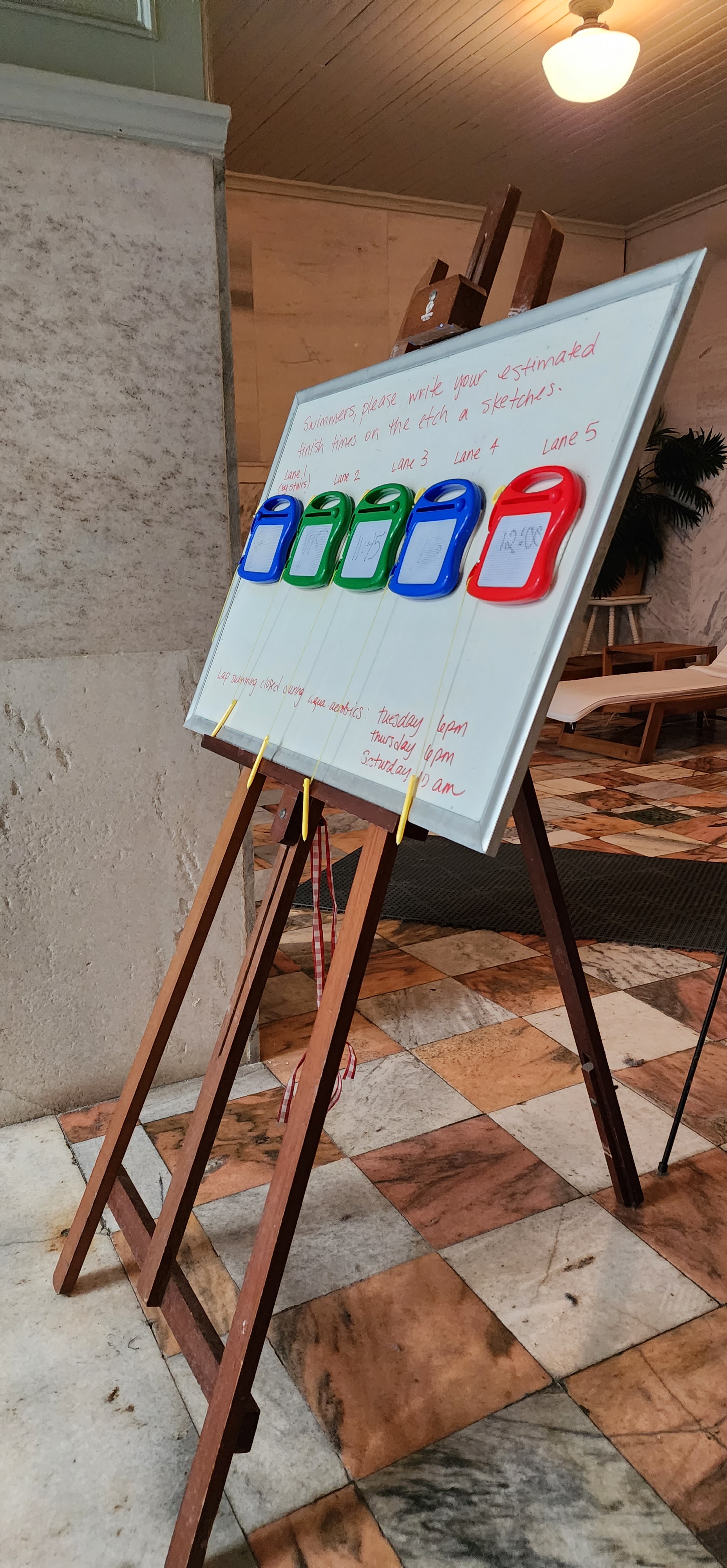 Upon arrival, I eagerly took the offer of a facility tour, ending at the pool, of course. Exhilaration and wonder flavored that first swim as the refreshing saltwater caressed my skin. So agog was I at the surroundings that I hadn’t seen the prominently-placed rules. I didn’t know that each lane is the white space BETWEEN the black tile lines, which serve as sunken lane ropes. As a result, I nearly collided with another swimmer! Flustered, I immediately apologized, and much to my relief, he forgave me for my newbie mistake.