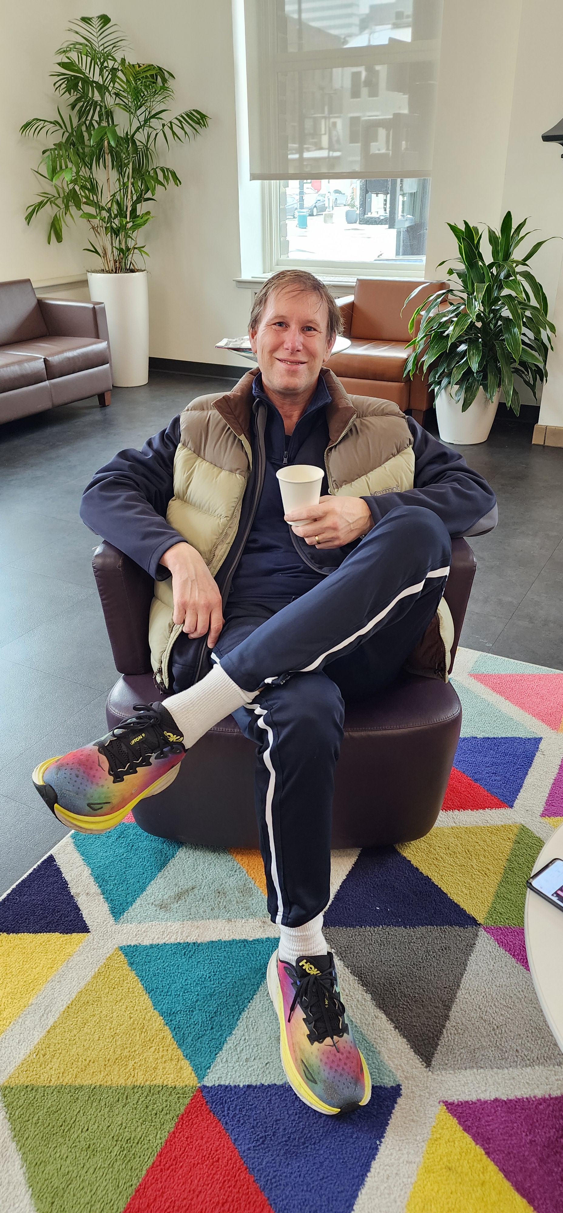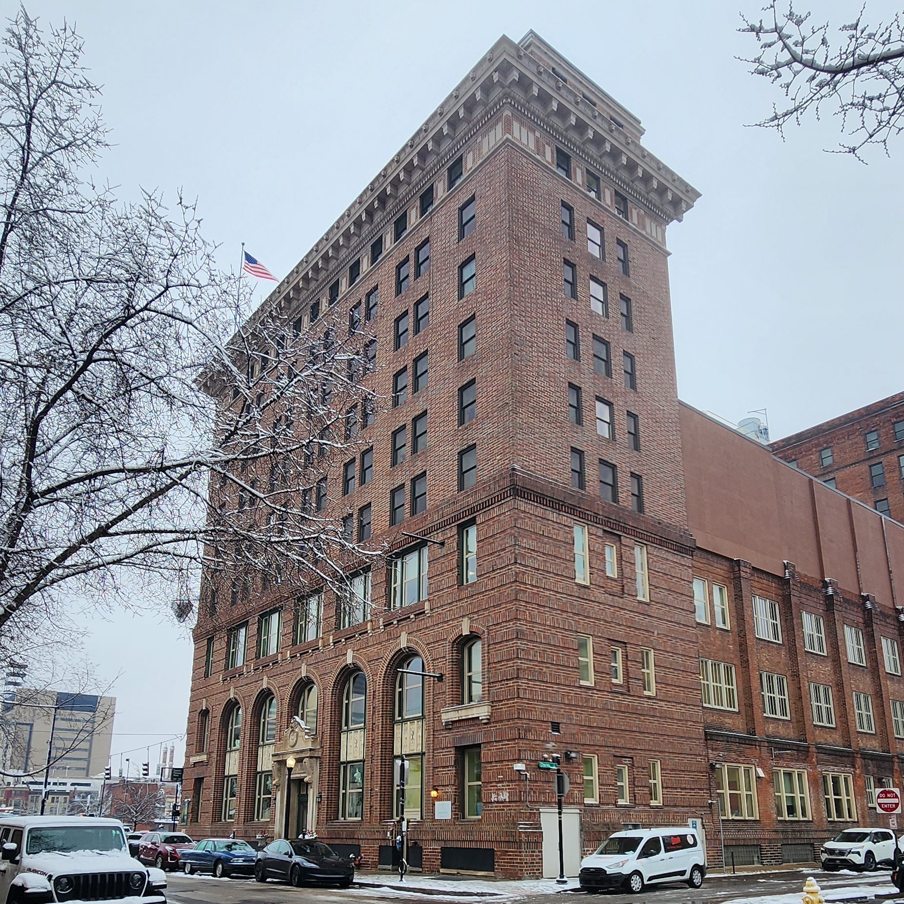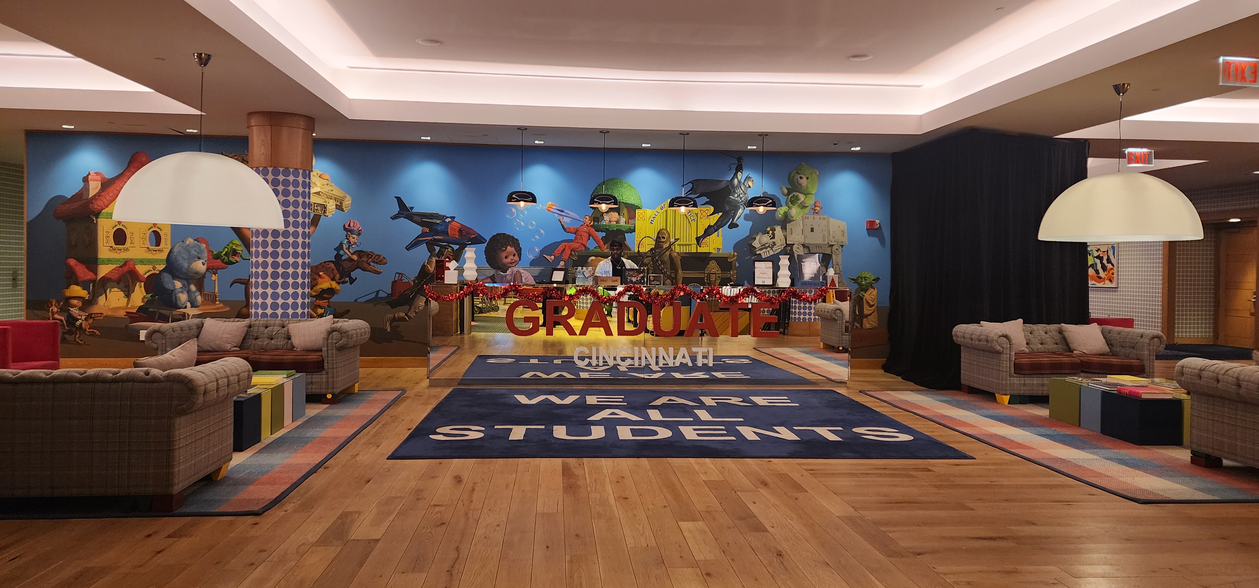 The morning after our arrival, we hiked 2.5 snowy, hilly miles from The Graduate Hotel through various gentrifying neighborhoods to the Central Parkway YMCA, right by Washington Park and the Cincinnati Athletic Club (which admits only men!) What a cool historic area! The Y was built in 1917 and was completely renovated and modernized in 2015-1016. The decor, I’d describe as “downtown funk,” with bright colors, geometric designs, and a big neon YMCA sign.