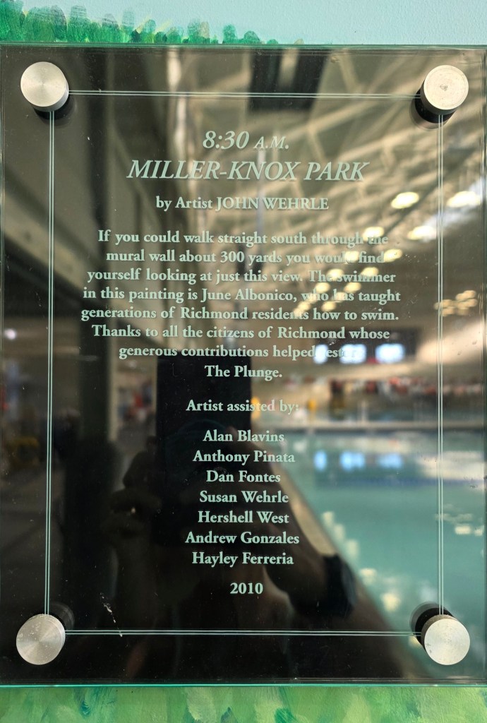 On the far right of this mural, a swimmer surveys the scene. The mirrored plaque below explains that this woman — June Albonico — “taught generations of Richmond residents how to swim.”