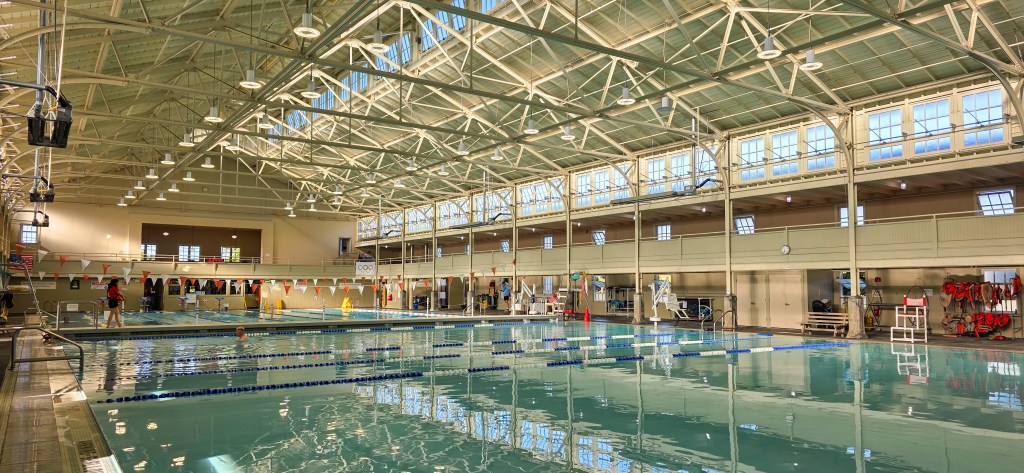 The Art Deco design and open ceiling trusses reflect aspects of San Francisco’s now-demolished Sutro Baths, a massive 1.7 million gallon facility that could accommodate 10,000 swimmers.