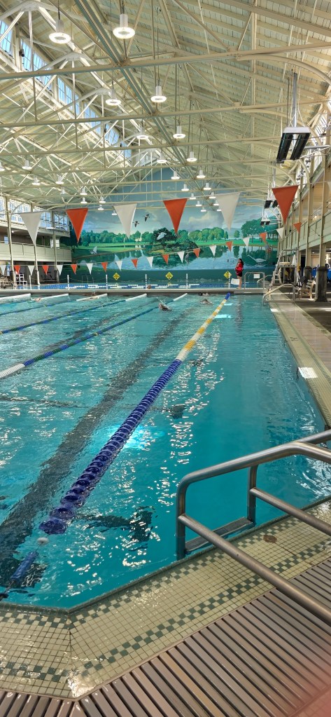 Stepping from the locker room onto the pool deck, I was struck by the bright, natural lighting from windows spanning the length of the facility, which includes a 7-lane, 25-yard section for lap swimming and team practices separated by a bulkhead from a shallower area with 20-yard lanes across the width. Gracing the wall of the far end is a huge pastoral mural of the nearby Miller-Knox Regional Shoreline Park.