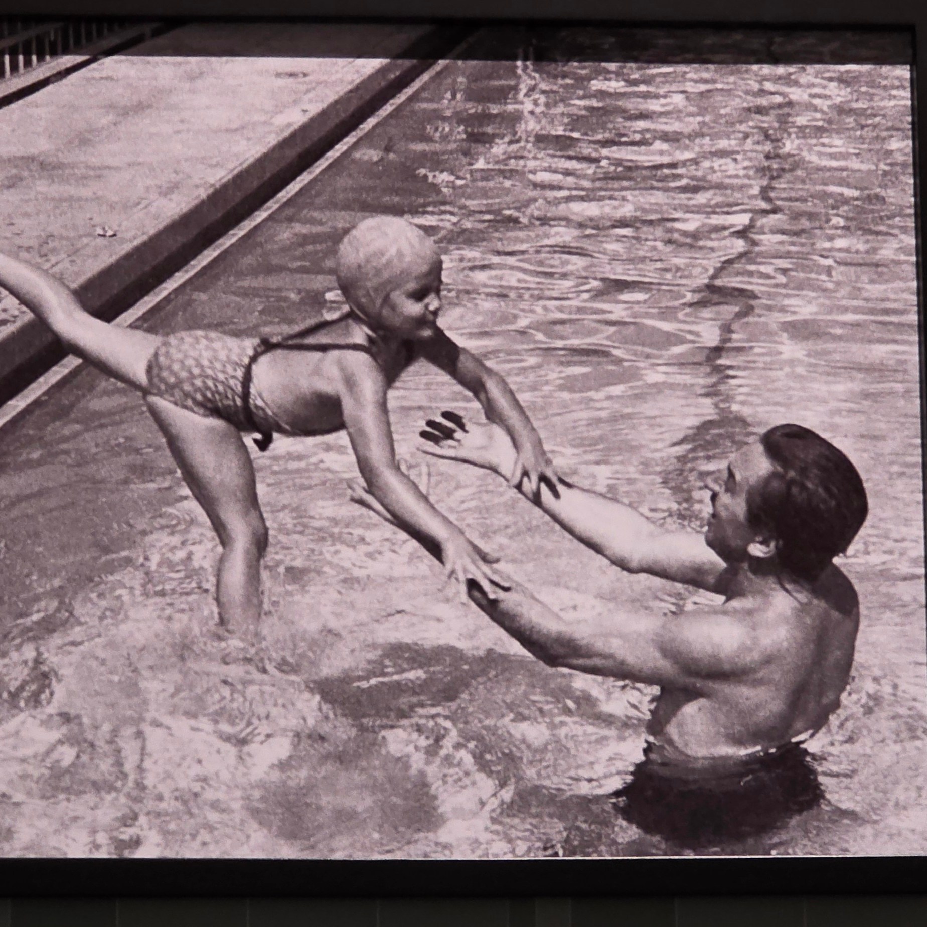 Left image: Walt teaches his daughter Wendy to swim. c. 1939. Location: Walt Disney Family Museum. Not public domain, but I’ll remove it if necessary. Too cute to omit!
